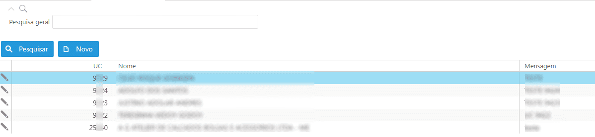 Uma mensagem de até 10 caracteres pode ser cadastrada com algum aviso sobre a UC que o leiturista irá realizar a leitura. Clicando em “Novo” uma nova mensagem poderá ser cadastrada.