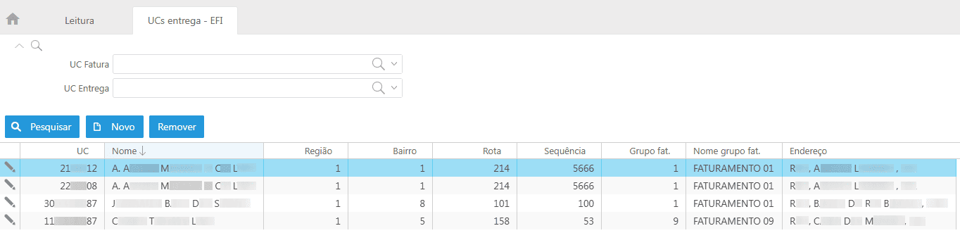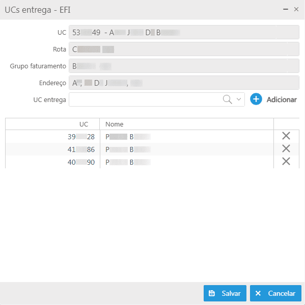 - Remover: faz a exclusão de um registro efetuado desvinculando a entrega das faturas de determinadas UCs a outras unidades.