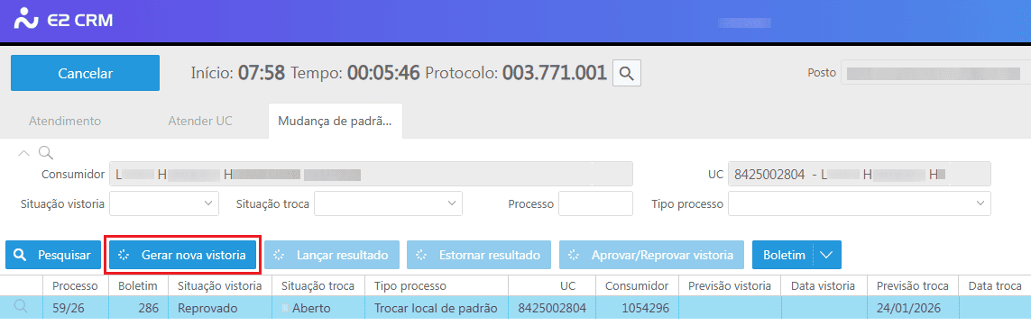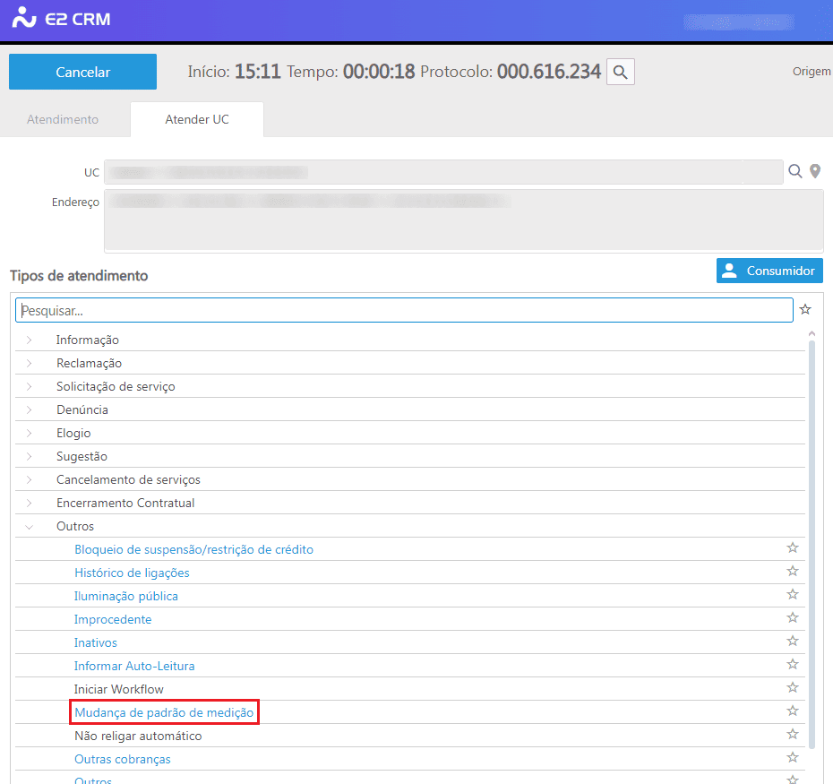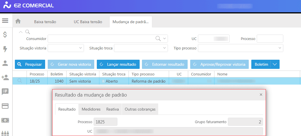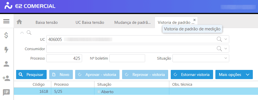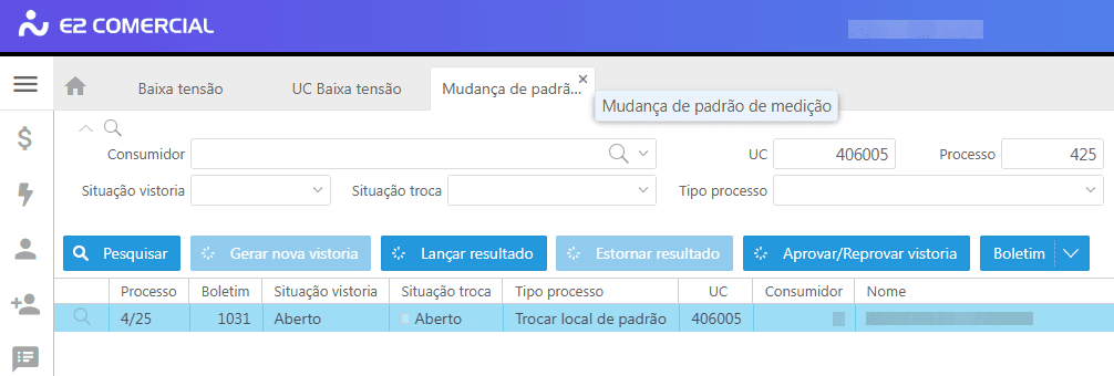 - Caminho: E2Com > CRM > Iniciar atendimento > Buscar pela UC > UC > Outros > Mudança de padrão de medição.