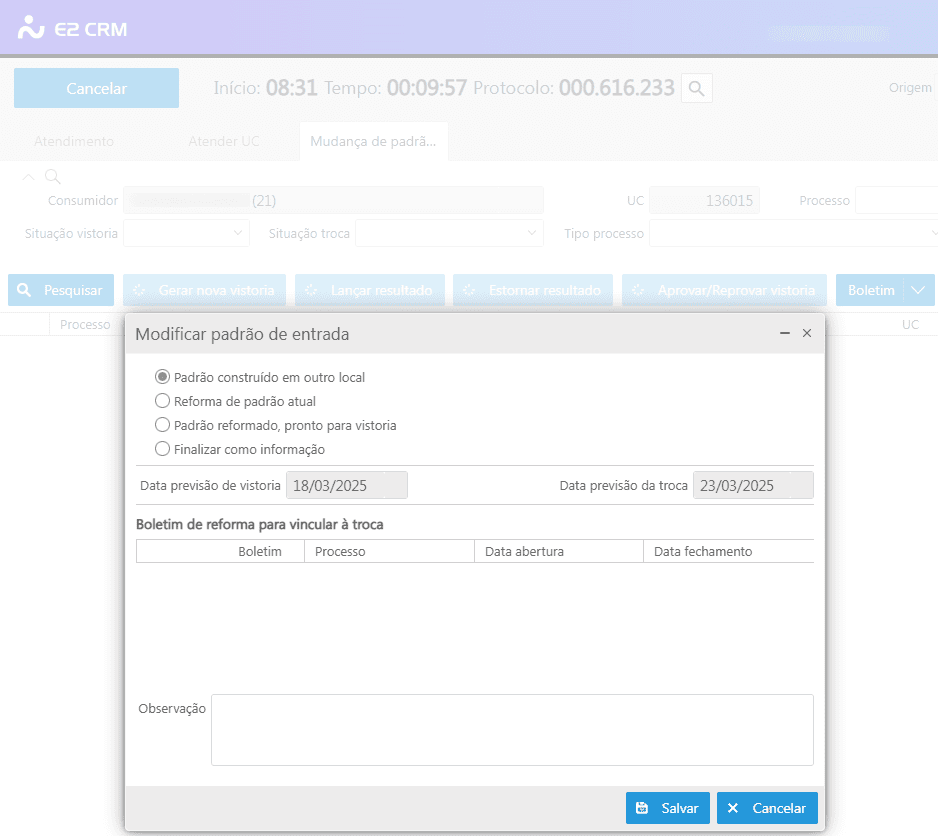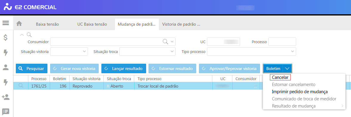 Para cancelar o processo, acessar o caminho no qual localizam-se os lançamentos de mudança de padrão de medição dentro do comercial, mencionado anteriormente. Buscar e selecionar o processo, clicar em Boletim, por fim escolher a opção Cancelar. Na tela apresentada preencher o campo Observação e clicar em Salvar.
