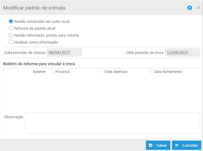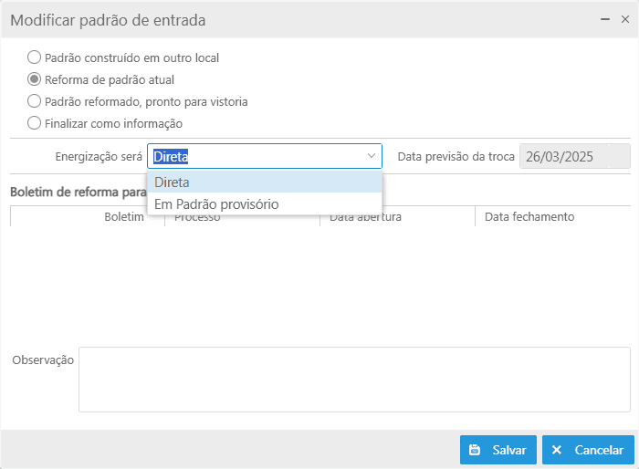 No lançamento do processo de mudança de padrão de medição, a opção Reforma de padrão atual, destina-se aos casos em que o padrão de medição da unidade consumidora passará por intervenções visando renovar sua estrutura.