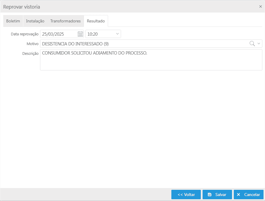 Caso seja aprovada a vistoria, será necessário revisar os dados anteriormente informados e neste momento apresentados na aba Boletim, preencher o que for necessário nas abas Instalação e Transformadores, em seguida informar na aba Resultado se o medidor foi instalado na vistoria.