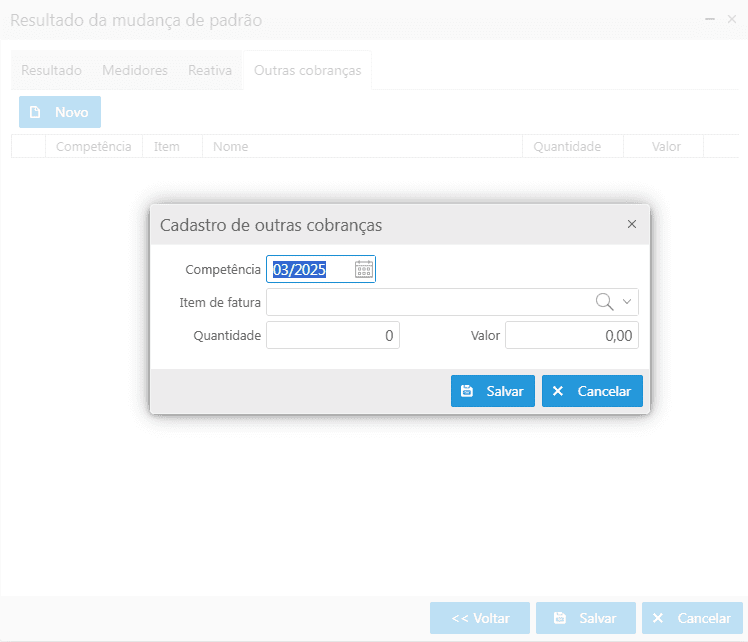 Além das abas referentes às informações de medição, há também uma aba destinada à inserção de outras cobranças, caso seja desejo da distribuidora efetuar uma ou mais cobranças específicas, basta cadastrar neste espaço.