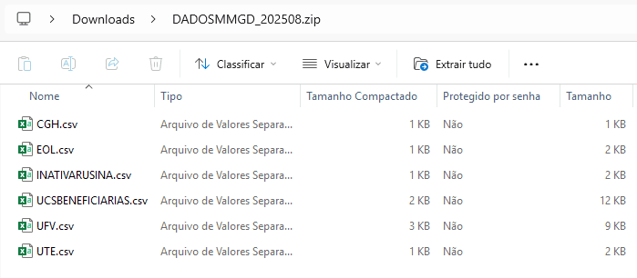 Em alinhamento com o Manual de Instruções MMGD, encaminhado pela ANEEL diretamente as distribuidoras, os arquivos a serem enviados para atendimento a solicitação da base MMGD são: UFV, EOL, UTE, CGH, UCSBENEFICIARIAS e INATIVARUSINA.
