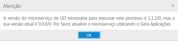 Ao acessar esta tela, pode haver o disparo do alerta de versão do microsserviço, conforme demonstra a imagem abaixo.