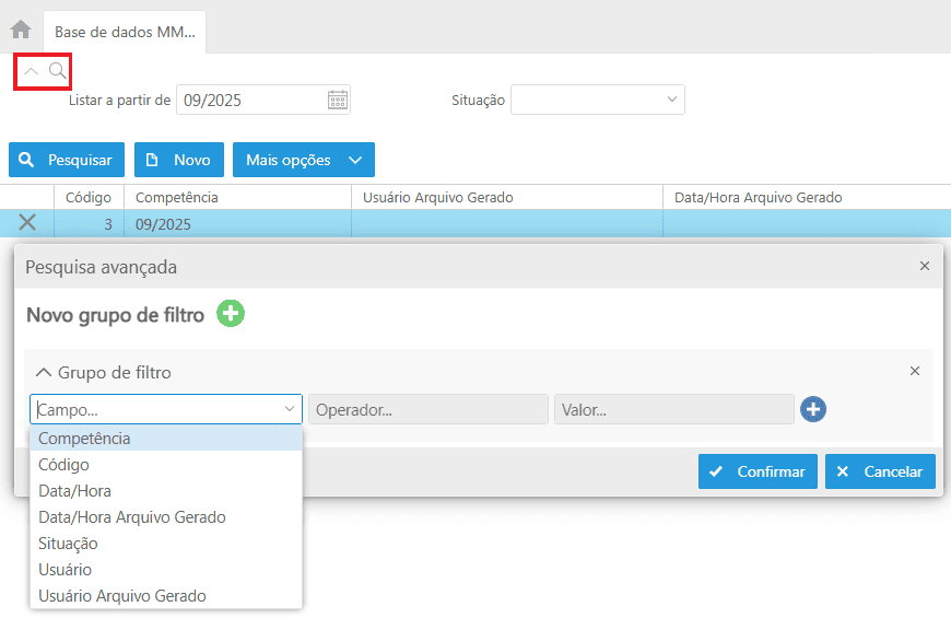 Serão observados dois campos de pesquisa, Listar a partir de onde ao inserir uma competência, o sistema fará uma busca de todos os registros existentes a partir desta competência.