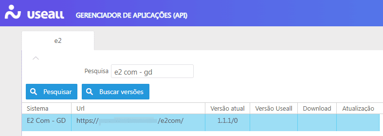 Para realizar a atualização, basta acessar o Gera Aplicações e buscar por E2 Com - GD. Clicar em Buscar versões aguardar o sistema realizar a busca, em seguida havendo uma nova versão será observado o botão de Download na coluna de mesmo nome, clicar neste botão e aguardar o sistema baixar a versão.