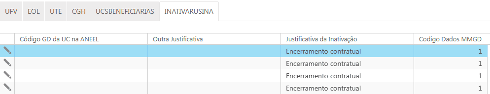 Já a segunda aba apresenta campos específicos conforme o tipo de geração de energia elétrica. Os dois últimos arquivos, UCSBENEFICIARIAS e INATIVARUSINA, possuem telas diferenciadas para edição dos dados.