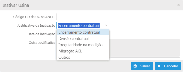 - Descrição: justificativa da inativação da unidade consumidora. Lista das justificativas: