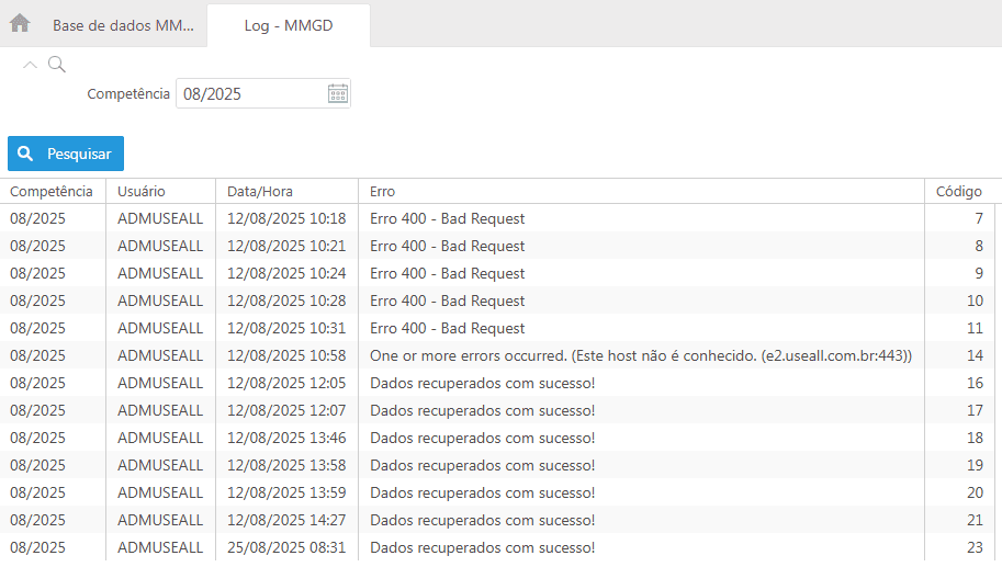 A tela de Log é exclusiva para apresentar informações sobre as tentativas de comunicação do sistema E2 Comercial ao P3 ADM. Ao identificar registros de erro, deve-se entrar em contato com a equipe de suporte da Useall para analisar a origem do alerta.