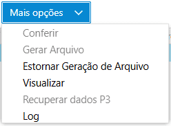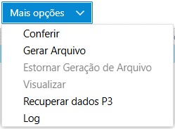 Selecionando o registro e clicando em Mais opções será possível observar as opções de Conferir, Gerar Arquivo, Estornar Geração de Arquivo, Visualizar, Recuperar dados P3 e Log.