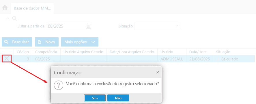 Neste momento, ao clicar em Pesquisar um novo registro será visualizado para a competência anteriormente informada. Na primeira coluna se observará um ícone de "X" o que permite eliminar o registro gerado após confirmação da mensagem de alerta.