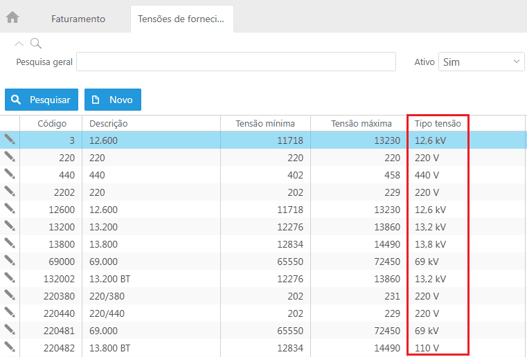 - Caminho: E2 Com > Faturamento > Listas > Distribuidora > Tensões de fornecimento.
