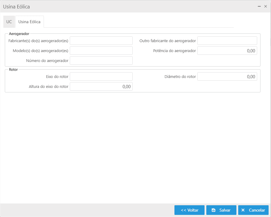 Levando em consideração o objetivo do arquivo de demonstração dos dados de usina aerogeradora, a segunda aba específica da tela de edição é dividida em duas subseções Aerogerador e Rotor.