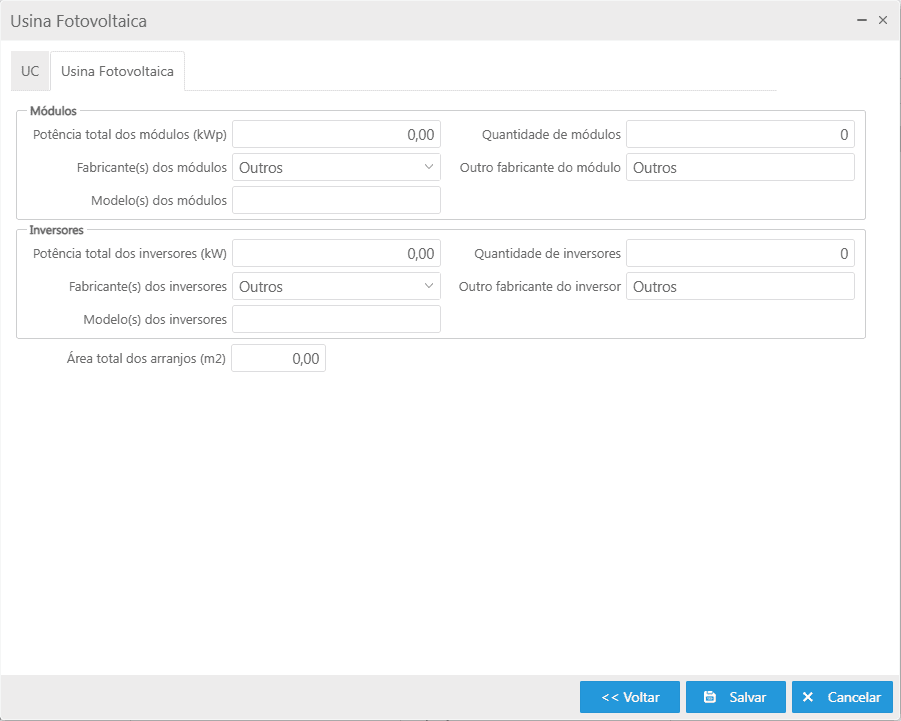 Conforme o objetivo do arquivo de demonstração dos dados de usina fotovoltaica, a segunda aba específica da tela de edição é dividida em duas subseções Módulos e Inversores.