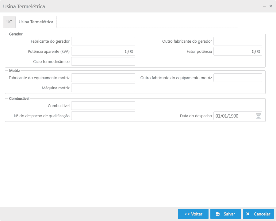 O objetivo do arquivo é a demonstração dos dados de usina termogeradora, assim a segunda aba específica da tela de edição é dividida em três subseções Gerador, Motriz e Combustível.