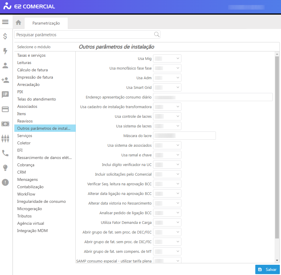 - Caminho: E2 Comercial > Início > Parametrização > Outros parâmetros de instalação.