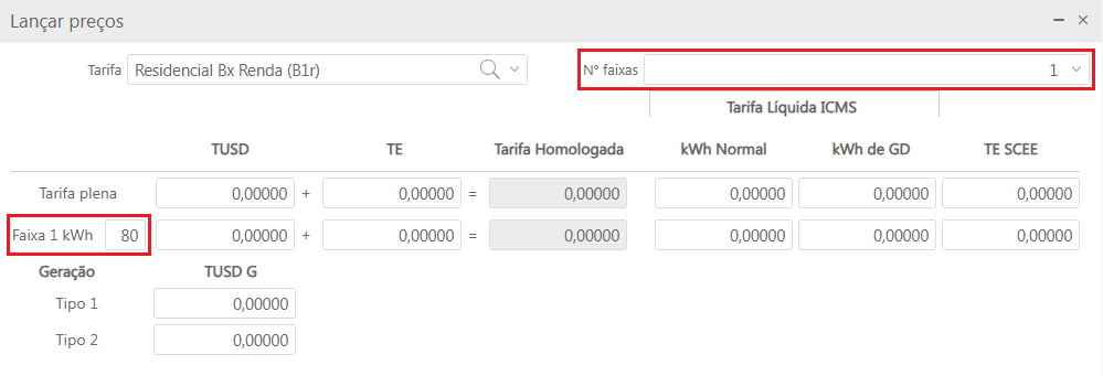 Deve-se criar apenas uma faixa com tarifa zerada até 80 kWh. O sistema aplicará automaticamente a tarifa plena para o que ultrapassar esse valor.